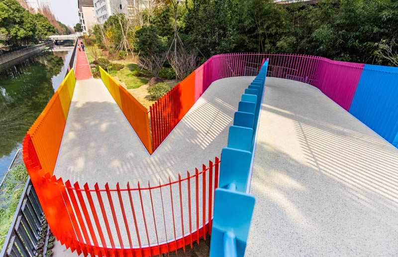 此外,設計師還按岸邊的高大樹木設計了彎道,讓彩虹橋看起來不像普通天橋那么筆直死板,也讓行人們可以享受到樹木的綠蔭。不僅如此,設計上,還貼心地用緩坡替代了一般天橋的階梯式上升方式,方便自行車和行動障礙者通行,不僅便利了行人,緩坡柔和的線條也增添了彩虹的視覺美感。