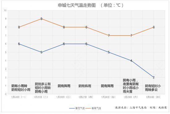 距離農歷新年,只剩下一周時間,上海進入了下雨模式。據上海中心氣象臺分析,今天(1月24日)延續昨日天氣,上午陰有小雨,中午前后轉為陰有短時小雨,伴隨著北到東北風4到5級,氣溫降至6到8℃。
