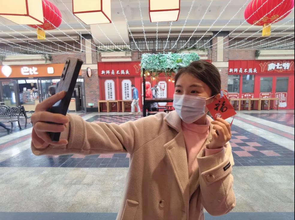 為了迎接春節的到來,太平洋森活天地特意設置了一處新春打卡區。寫滿福字的墻面十分“吸睛”,不少市民來此拍照“凹造型”、掃“!弊旨甯!