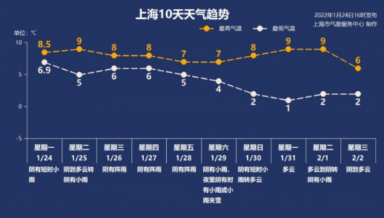 從今天夜間開始,上海又將開啟新一輪連續降水過程,其中本周三至周五,雨勢最為明顯,工作日氣溫在5-9℃,陰冷體感纏身,周日起受冷空氣影響,氣溫進一步下滑,雨水漸止轉多云,目前來看除夕、年初一和初二以多云為主,不過氣溫低迷,最低在1-2℃。