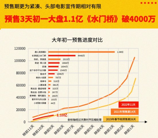 相較2021年,2022年春節檔整體時間相對較短,大盤預售整體有一定的差距,但就單片來看,今年預售3天表現普遍表現優于去年。