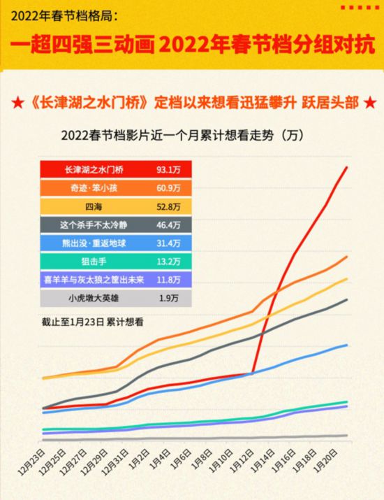 數據顯示,2021年春節檔票房達到歷史新高78億,檔期日均票房首破10億,《唐人街探案3》《你好,李煥英》兩部影片占比甚至達到春節檔總票房的八成,凸顯了年度第一大檔期競爭的激烈。2022年,《長津湖之水門橋》定檔以來想看迅猛攀升躋身頭部,《奇跡·笨小孩》《四!贰妒沁@個殺手不太冷靜》《狙擊手》競爭激烈,2022年春節檔整體呈分組競爭之勢。