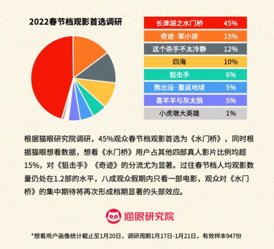 《長津湖之水門橋》定檔11天想看新增72萬,45%觀眾春節檔觀影首選為《水門橋》,想看《水門橋》用戶占其他四部真人影片比例均超15%,對《狙擊手》《奇跡》的分流尤為顯著。