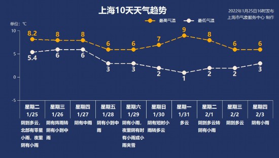 上海中心氣象臺2022年1月26日5點鐘發布今天和明天上海市天氣預報:陰有零星小雨,今天上午起陰有陣雨,今天傍晚到明天陰有中雨。東北風4-5級。今天最高溫度8度,明天最低溫度6度。今天相對濕度65%-95%。