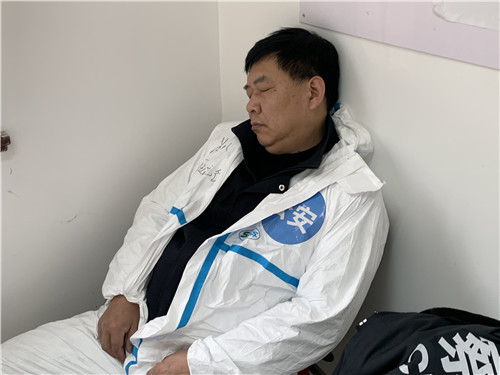 擔心頻繁穿脫防護裝備會增加感染的風險,工作時間里他們很少喝水,有時忙起來更是忘了喝,往往一整天喝不足一杯水,錯過飯點也是家常便飯。累極了就穿和著厚厚的防護服在臨時休息點瞇一會。