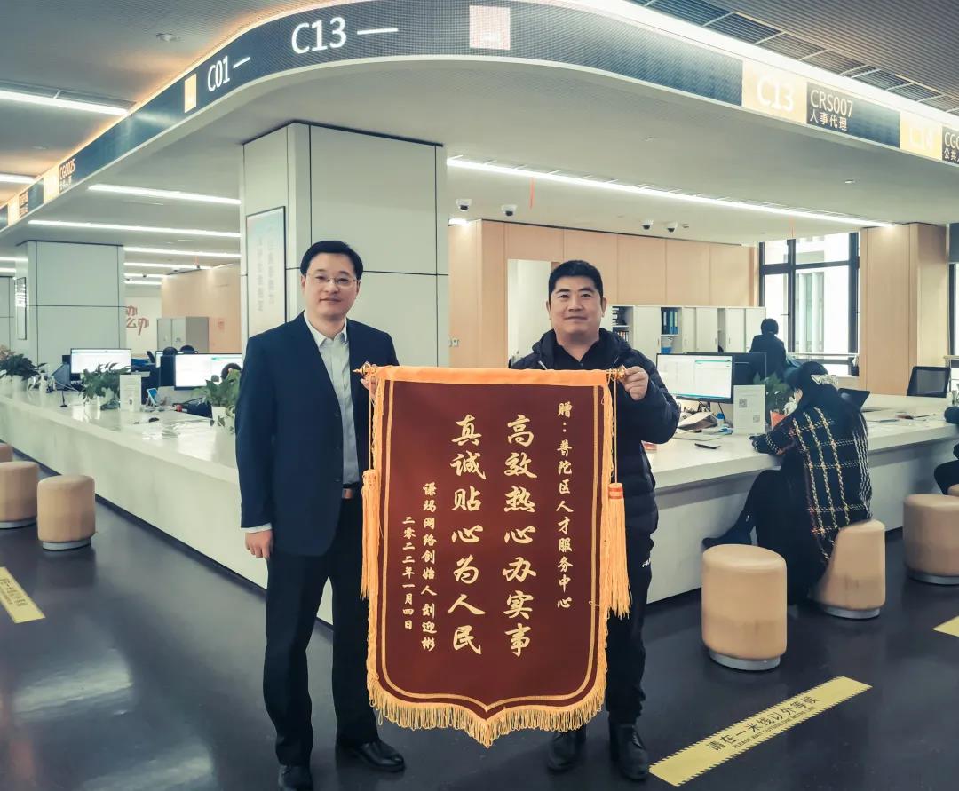 上海謙瑪網絡科技有限公司創始人向區人才服務中心送上錦旗