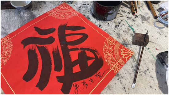 朱者赤是去年7月入駐藝術村的自由職業藝術家,今年,他決定留在林家村過年,他希望以送“!钡姆绞絹肀磉_自己真摯的祝福,與村民們一起歡度春節。581幅各不相同的藝術“!弊,正是他送給村中581戶家庭的新年禮物!叭腭v半年來,政府部門的關心幫助和支持與村民們熱情地問候讓我非常感動,我懷著感恩的心情,寫下這581個創意福字!敝煺叱嗾f。