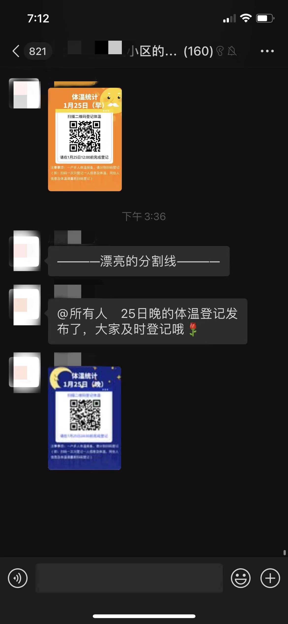 微信群,居民主動上報體溫信息。誠禮居民區供圖