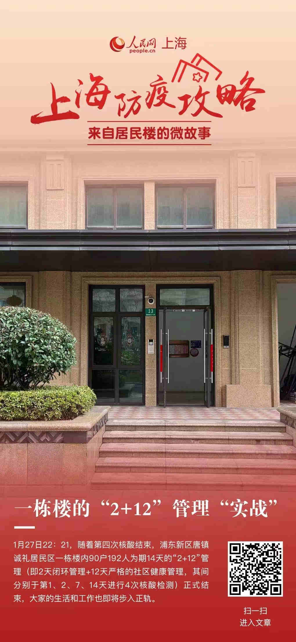 1月27日22:21,隨著第四次核酸結束,浦東新區唐鎮誠禮居民區一棟樓內90戶192人為期14天的“2+12”管理(即2天閉環管理+12天嚴格的社區健康管理,其間分別于第1、2、7、14天進行4次核酸檢測)正式結束,大家的生活和工作也即將步入正軌。