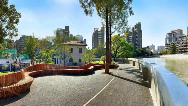 漫步在蘇州河華政段步道,百年前圣約翰大學的歷史建筑群與蘇州河自然景觀融為一體,呈現出思孟園、格致園、倚竹院、獬豸園、華政橋、桃李園、東風角、法劇場、銀杏院和書香園十個景觀,原本分隔校園與河濱步道的圍欄全部被拆除,歷史的厚重與人文的傳承完美融合,實現了歷史與現代的對話。全長約900米的華政段濱水空間,成為了上海濱河歷史風貌中的一顆璀璨明珠。(來源:上海長寧)