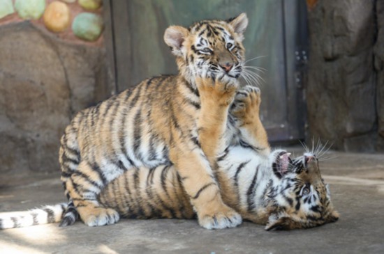 在小動物樂園里,4月齡大的東北虎龍鳳胎和白虎寶寶萌翻了游客。只見三只小虎正團在一起酣睡,據“奶爸”介紹,剛來小動物樂園的時候它們才巴掌大小,現在三只虎寶寶的體重都已超過了13千克。龍鳳胎中,“虎姐姐”學習能力特別強,“虎弟弟”較膽小且安靜,白虎寶寶則很活潑。