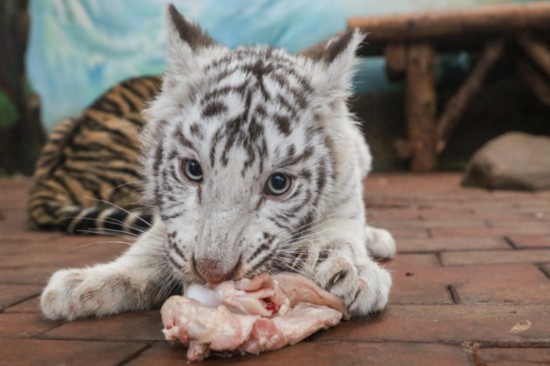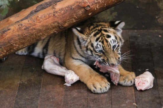 春節臨近,動物園特地給它們準備了牛仔骨和兔腿拼盤,這是三只小虎仔第一次開吃帶骨的食物,也叫“開食”,希望他們早日成為真正的猛虎。