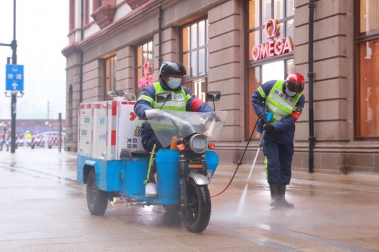 大紅燈籠下,黃浦城發集團欣誼環衛公司南步街保潔班的曹師傅,正準備開啟新一天的工作,他的任務是對步行街公共區域進行消毒。從公共電話亭、沿街的坐凳、,到騎樓建筑下的通道和支馬路,每一處游客能接觸的部位都噴灑消毒水,嚴格做到不留一處死角。