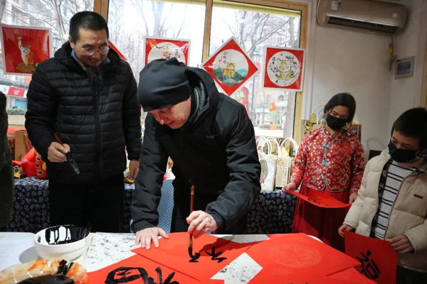 與此同時,來自古北社區的書法家虎嘯、趙達老師也蒞臨現場,為居民書寫春聯,吸引了中外居民共同參與。