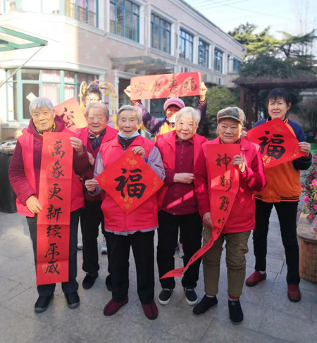 對春聯、剪窗花、貼福字,臨近春節時,萬宏養老集團各養老機構、社區服務設施組織工作人員與長者們開展各類貼福字活動,喜氣洋洋的裝飾讓節日充滿儀式感。