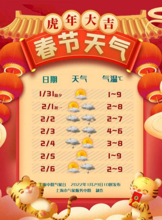 春節假日以過程性天氣為主,2月2-3日和6日后期各有一次降水過程,其中2日夜間有小雨或小雨夾雪;2-4日長江口區東部和上海市沿海海面陣風7~8級。春節期間本市平均氣溫較常年同期(5.5℃)偏低,最高氣溫6~9℃,最低氣溫大都在1~3℃;1月31日和2月5日早晨在輻射降溫影響下,氣溫較低,極端最低氣溫市區1℃,郊區可達零下4℃~零下2℃,有薄冰或冰凍。另外,1月31日早晨本市局部地區有霧。