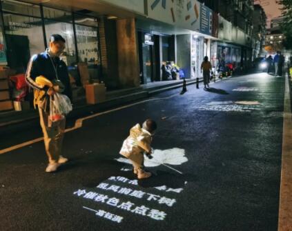 夜幕降臨,四平路1028弄亮起了星星點點的燈光。銀杏葉、梧桐葉和一行行詩句透過金黃色的燈光,投射到地面上,照亮了居民們的回家路。白領和學生們踏“詩”前行,結束了一天的忙碌。