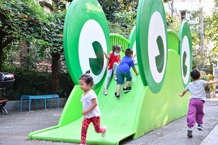 傍晚時分的口袋公園充滿著歡聲笑語。青蛙滑梯從街頭“冒”了出來,貪玩的孩子們還在樂此不疲地上上下下,老人們坐在形狀各異的座椅上共話家常,一派溫馨和諧。