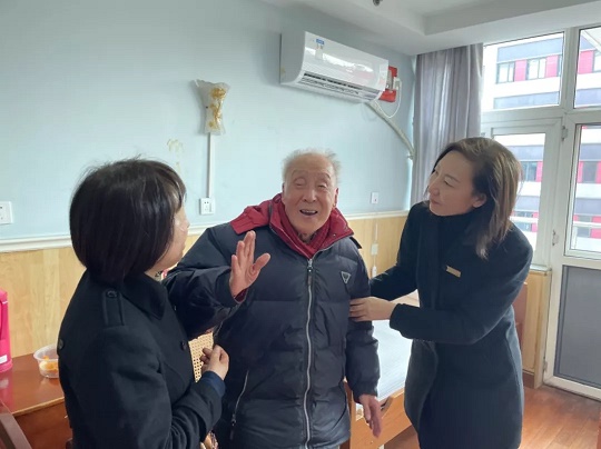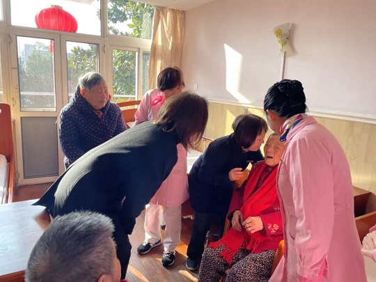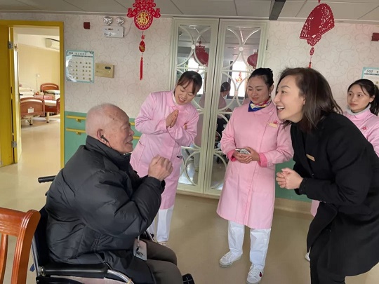 除了裝點環境,營造氣氛,楊福院新年還講究“串門兒”。除夕一大早,楊福院負責人喬毅皓就帶著一眾護理員、工作人員,組成了一支“拜年小分隊”,走遍每一棟住養大樓、每一樓層,給爺爺奶奶們挨個兒拜年。大家拱手作揖,說吉祥話,逗得老人樂個不停。
