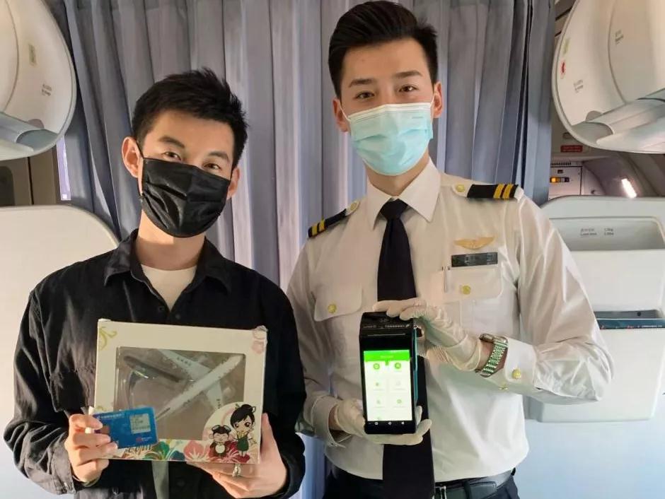 節前,在春秋航空上海飛往廈門的9C8815航班上,一位乘客選購了春秋航空的特色產品飛機模型,隨后取出自己的數字人民幣“硬錢包”,在乘務員手持的支付終端上輕輕一碰,完成了支付。