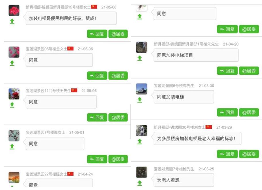 充分利用“社區通”平臺的影響力,居民們自發在平臺商議裝電梯事宜,并以高票數通過議題;發布海報、宣傳手冊,將加裝電梯的政策、流程等向居民宣傳,以通俗易懂的方式告訴市民“怎么裝”“找誰裝”“遇到問題如何辦”;社區黨總支書記組織居民分批實地考察電梯安裝公司,消除居民疑慮,主動引導居民增強加梯意愿。