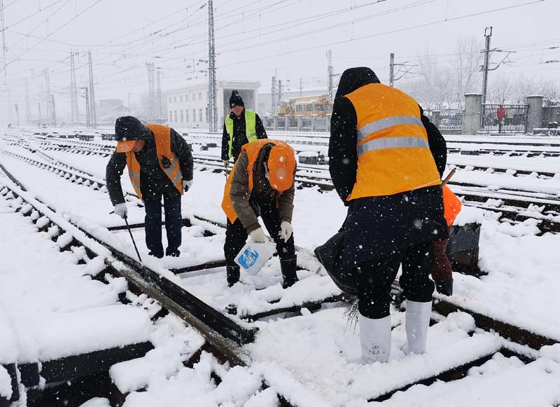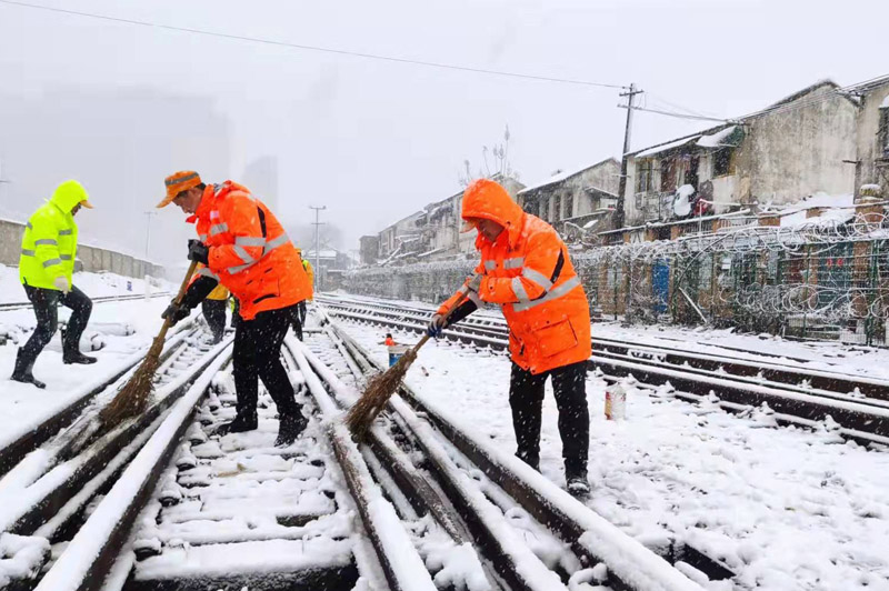在安徽皖南,蕪湖車務段針對管內普降大雪的情況,及時組織黃山北、蕪湖等車站成立由120多名黨團員組成的11支掃雪突擊隊,分赴現場開展掃雪除冰;在江蘇南京,車站安排110 名掃雪人員攜帶鐵鏟、融雪劑、鼓風機等用具物品值守在掃雪崗位上,在風雪中鋪設草墊 260塊,截至目前車站各趟列車運行秩序正常;在江蘇揚州,及時出動21人進行掃雪除冰、組織站臺旅客安全乘降,確保旅客在雨雪天氣能順利出行。