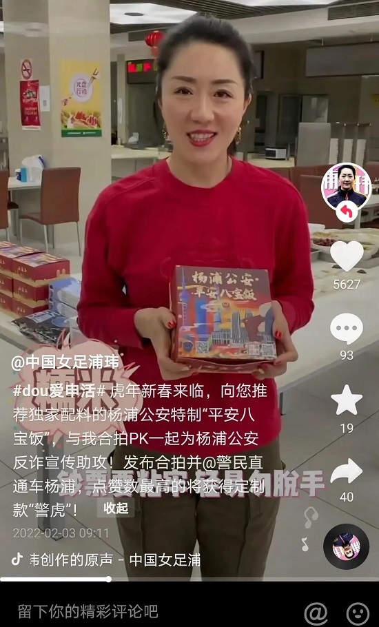 中國女足問鼎亞洲杯!來看前女足隊長和楊浦民警合拍的“平安八寶飯”!