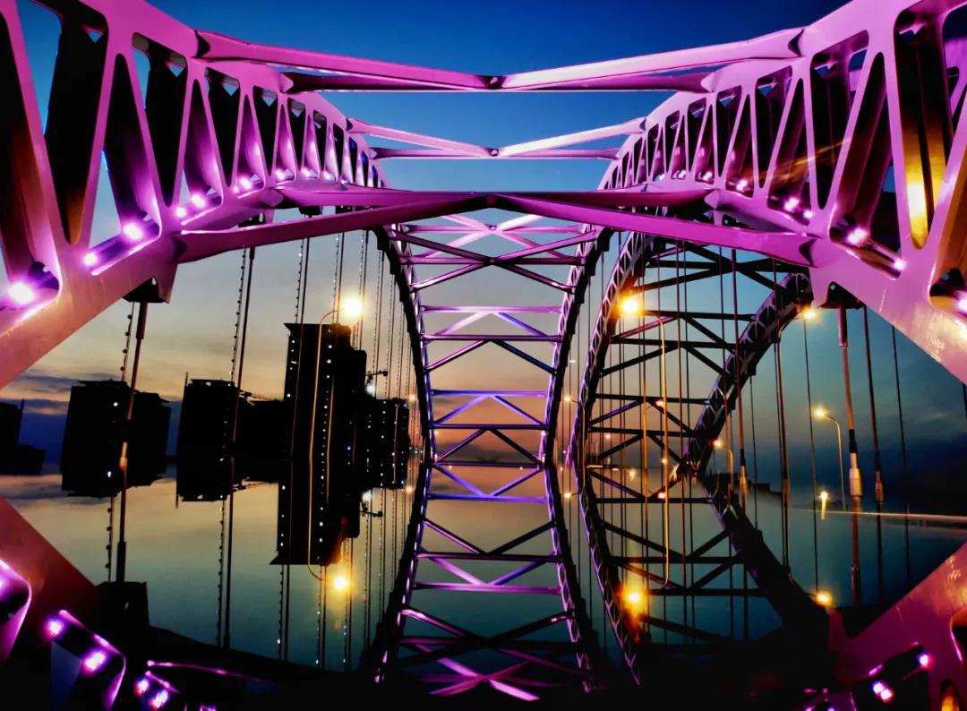 橋體除了連續跨掘石港航道及兩岸主道路并增設匝道外,主橋設計采用下沉式鋼桁架拱橋,這種橋型結構輕巧,整體性強,比一般帶拱上建筑的肋拱橋受力更合理,材料更節省,適用于土軟的地區。剛柔并濟的造型讓人過目難忘,將玉帶般的流暢曲線和剛勁有力的桁架形式相融合,也可以說是一次橋梁科技、美學與人文的融合。