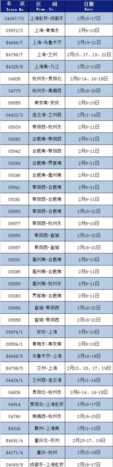 另外記者從上海鐵路獲悉,為滿足春節旅客出行需求,部分車次陸續恢復開行,F在整理了近期恢復開行的車次。增開列車車次及時間以車站公告為準,后續增開列車信息請關注上海鐵路12306微信公眾號或車站公告。