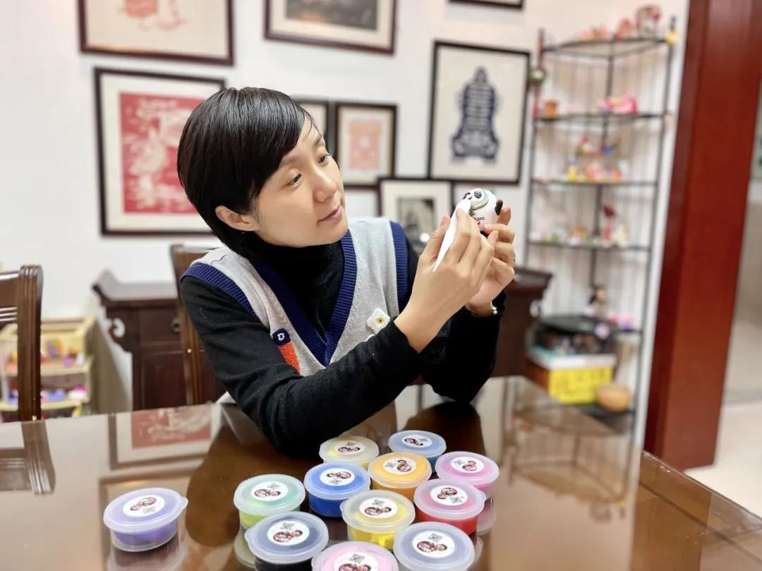 張書嘉是來自長寧的非遺面塑傳承人。她十歲起師從面塑大師“面人趙”之女趙鳳林,成為非遺“面人趙”第三代傳承人。自上海交通大學畢業后,2007年張書嘉成立了書嘉手藝中心,以保護傳承面塑為基石,在研究闡發、教育普及、創新發展、傳播交流等方面協同推進,逐步摸索開辟了一條非遺傳播傳承創新之路。她還開設了“創意面塑”興趣班,參與舉辦“非遺進社區”“非遺進校園”“非遺進商圈”等系列項目。這次用面塑制作“冰墩墩”,是她的又一次探索。