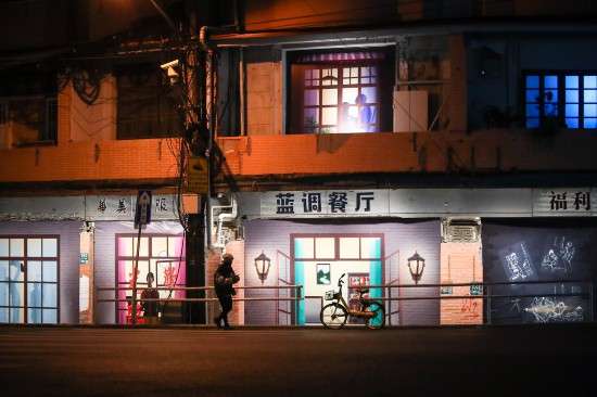 浙江路橋這幕燈景主題為“萬家燈火”,青年藝術家黃賽峰首次到場地時,看到舊改基地內的老房已被封掉的場景,感覺有些落寞。老城廂的煙火氣縈繞在他腦海中,于是他用畫筆創造了新的圖景。作為主體景觀的橋畔老房自下而上分為三段:一層為商鋪,用燈光配合老派風格的簡易招牌和噴繪版面,營造出老城區熙熙攘攘的市井氛圍;二層和三層是居民住宅,在實景陽臺點綴綠植,窗內以剪影具象,結合內透和外打光,虛實結合地展現出生活景象;頂部再現了上海民居特有的老虎窗……
