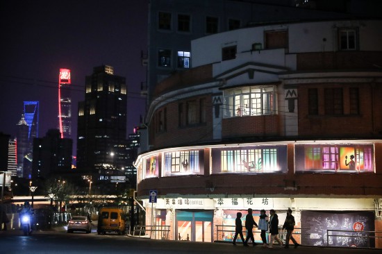 蘇州河燈光從非物質文化遺產“中國皮影戲”中獲得靈感。圖為西藏中路728號美欣大廈側墻。海沙爾攝