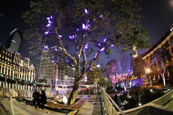 在蘇州河黃浦段燈景打造中也大膽模擬了自然。如,在靠近新閘路的岸線旁,借助霧森機等氛圍設備的烘托,一束束金燦燦的光穿過樹木,打造出光影搖曳、“向光而生”的婆娑林蔭道景觀,這正是模擬了“晨曦之光”。