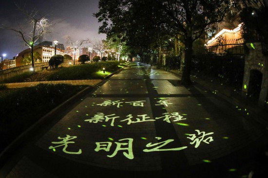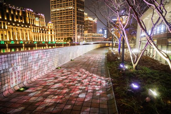 蘇州河岸線(新閘路-西藏中路)段有一段“冥想步道”,設計團隊利用投影燈將“字”與“形”相結合,投射在步道上,市民游客可以在文字的“田壟”上走過,沐浴光的洗禮。設計團隊在這里還加入了征集心聲妙句的二維碼,市民游客可以掃碼輸入創意語句,經審慎篩選后將可能成為“冥想步道”的新景致。