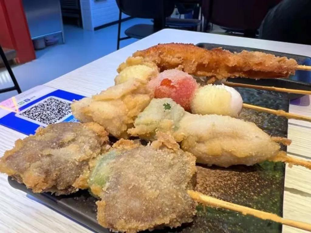 大阪炸串同樣是一份地道的日式小吃。拼盤里蓮藕、鵪鶉蛋、蝦、雞肉、牛肉一應俱全,選擇大阪招牌炸串醬、BBQ醬或沙拉醬予以調味,金黃的外衣下包裹著食材的鮮,炸物的快樂一秒get。
