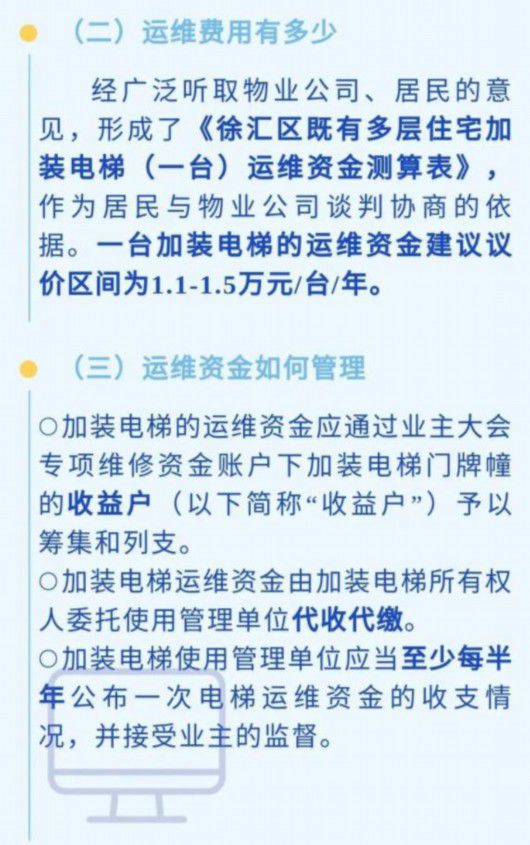 △徐匯區給出的加裝電梯運維資金建議議價區間為1.1萬元至1.5萬元每臺每年。