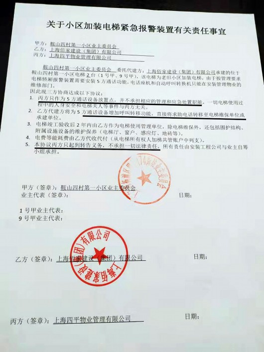 而相關指導意見中明確物業服務企業應該提供接警的托底保障工作。春節前,在街道房辦的協調下,四平物業松口表示愿意將緊急報警裝置安裝到物業維修部,但提出報警電話需直接呼叫轉移給加梯代建方或維保單位,同時居民們需要簽署同意物業提供的一份“免責”協議。由于對免責協議條款存在分歧,雙方遲遲未能達成共識。節后上班首日,居民代表們再次來到物業處協商此事,物業這才松口愿意調整協議內容,但仍然拒絕居民們提出的接管要求。