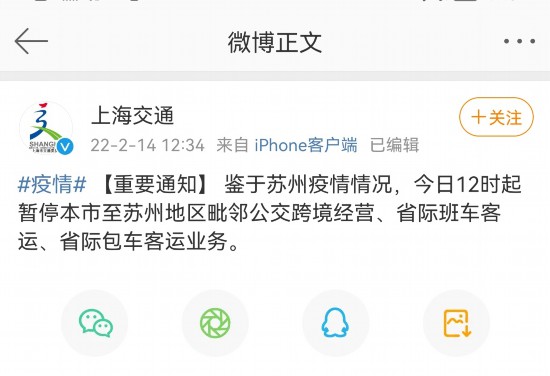 東方網記者劉輝2月14日報道:記者今天從上海市道運局獲悉,鑒于蘇州疫情情況,根據市交通委要求,為防止疫情通過道路客運行業傳播,2月14日12時起,暫停上海市至蘇州地區毗鄰公交跨境經營、省際班車客運、省際包車客運業務。