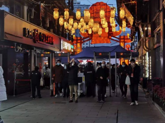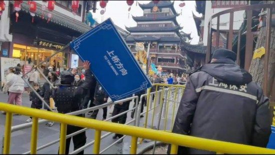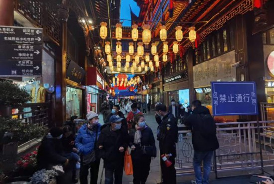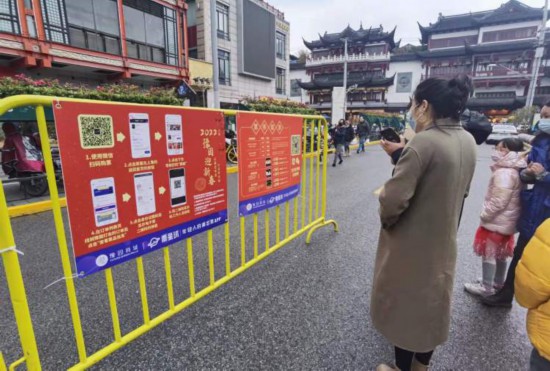 記者今天下午在豫園商城的外圍看到,人民路麗水路路口、福佑路舊校場路口、校場街市舞臺側矗立著三組售票亭。在離豫園尚有一段距離的道路上,蛇形通道已然啟用,佩戴口罩、掃描健康碼才可入內。