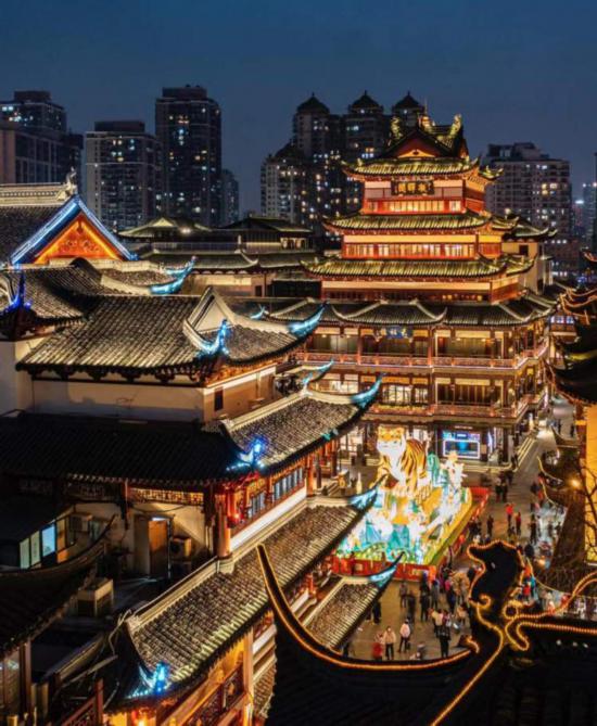傍晚五點亮燈,整個豫園商城張燈結彩。中心廣場高約9米的“虎躍東方”生肖燈組尤為壯麗。華寶樓墻面,一幅“千里江山圖”徐徐展開,寫就“百年恰是風華正茂”圖卷,呼應巍峨的虎燈。