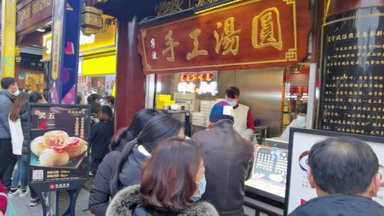 記者注意到,老桐椿目前不需要排隊,入店可吃;寧波湯團店的堂吃也不需要排隊,但外賣窗口排著長龍。一名阿婆說自己元宵節來買點生的手工湯團回家去煮,“這里是最傳統的,皮子筋道,餡料香!