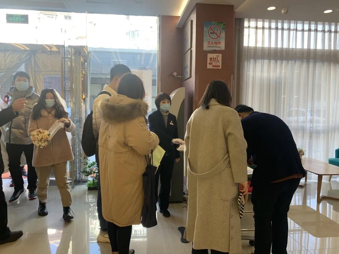 工作人員提醒準備登記結婚的新人們,前來辦理時需戴好口罩,進入室內主動配合測溫、出示“二碼”,做好防疫措施。