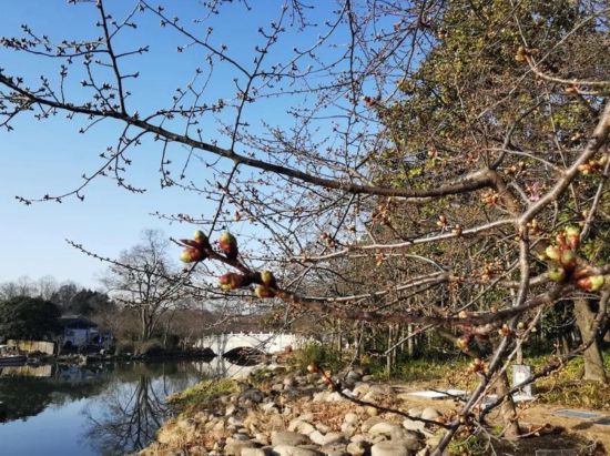 在上海植物園牡丹園的河岸邊,三株河津櫻已有零星花朵開放,但仔細觀察,這些已開放的花朵仍是去年秋冬以來因溫濕度適宜提早萌發的花芽,其他大部分的河津櫻花芽尚處于現蕾階段,距離真正進入花期還有一段時日,與去年同期相比,花期有明顯的推遲。