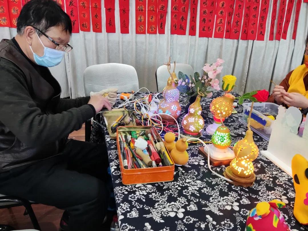 現場編織冬奧明星“絨耀之花”;迷你版“旱”冰壺模擬冰雪競技“冰壺”運動;冬奧頂流“冰墩墩”畫在傳統畫扇上;手工制作布藝老虎、兔子燈,為元宵節增添祥和、歡樂的氛圍,洋溢著濃濃的年味兒。