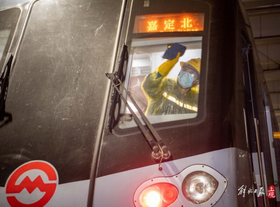 2022年2月14日晚,隨著首列11號線地鐵回庫車輛入庫,上海地鐵物業管理有限公司列車保潔二部11號線上海賽車場基地列車保潔班組的工作人員開始了車輛防疫消毒工作。