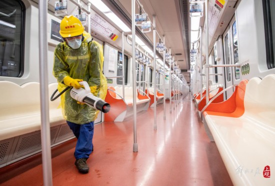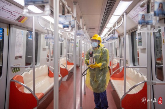 “節假日期間不少市民選擇乘坐地鐵攜家出行,我們更要堅守防疫工作一線,確保每位乘客安心乘車,安全出行!痹趰徚魷^年的安徽籍地鐵保潔人員孫功年在基地里做維保工作已有10余年,疫情以來,他和其他5位班組人員每夜值守防疫一線,確保每一輛車消毒防疫工作到位。