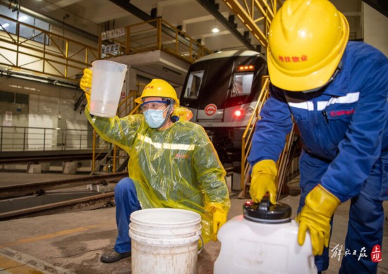 保潔人員調配好藥水后,背著20余公斤的消毒器具上列車保潔、噴藥,對基地內一百五十多節地鐵車廂依次完成防疫消毒保潔。