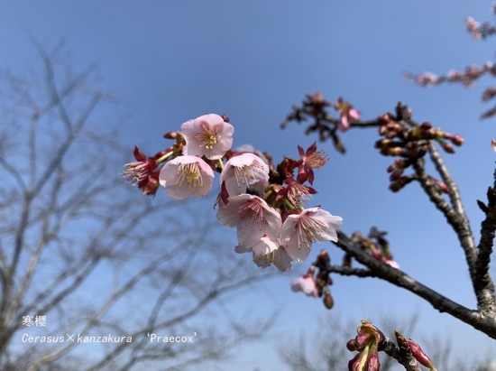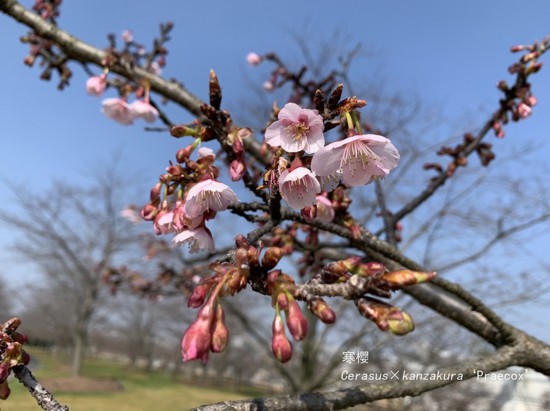 寒櫻(Cerasus × kanzakura ‘Praecox’),落葉小喬木,樹皮紫褐色,常呈黑色。枝條斜向上伸展,樹形成瓶狀,小枝較粗;幼葉紅褐色,成葉上面暗綠色,下面淡綠色微泛白,葉面略成“V”字形;花淡紅色,花瓣5枚,傘形花序,先葉開放;萼暗紫紅色,萼筒筒狀鐘形,花柱稍低于雄蕊;果實近球形,成熟時紫黑色。寒櫻被認為是鐘花櫻和山櫻類的雜交品種,花期非常早,幾乎與梅花同期開放。