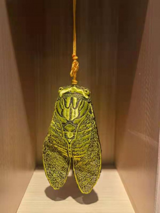 “觀”,意為觀賞。參觀者可在這里直觀地感受香囊的精美。整面香囊墻由180種不同款式的香囊組成,形態從動物到水果,材質從絲質到木質,濃縮了千百年的香囊變遷史。其中,一個全手工制作的“知了”香囊,吸引了不少參觀者拍照。它整體外形皆由絲線繡成,眼睛、腦袋、蟬翼等紋理細節栩栩如生,極具靈氣。