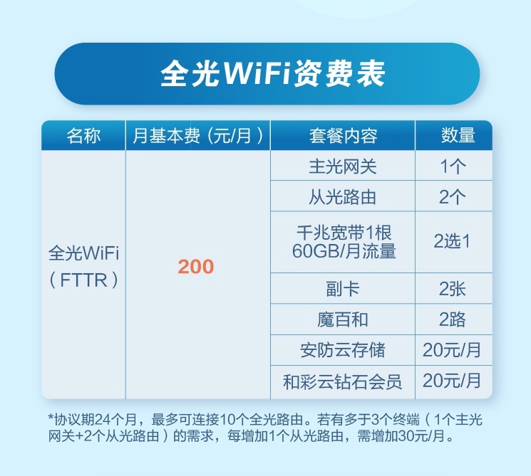 據了解,當前上海移動推出的全光WiFi(FTTR)業務每月基本費為200元,其中包括7大項服務。首先,用戶可以在辦理1根千兆寬帶和每月60GB流量之間進行2選1,如家中已有移動千兆寬帶,則可以選擇給流量擴擴容,反之則可以進行千兆寬帶、全光WiFi同步升級,相對當前市場上其他辦理方案,自由度更高。此外,該套餐還涵蓋網絡硬件、通信服務和數字權益,硬件部分包含1個主光網關與2個從光路由,均用于家庭組網;通信服務具體包含2張副卡、2路魔百和,實用性較高;數字權益則為安防云存儲與和彩云鉆石會員。綜合來看,如辦理這款全光WiFi套餐,在實現家庭網絡迭代的同時,還可基本滿足一個三口之家的移動通信和娛樂需求。